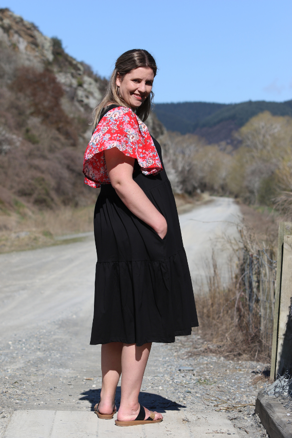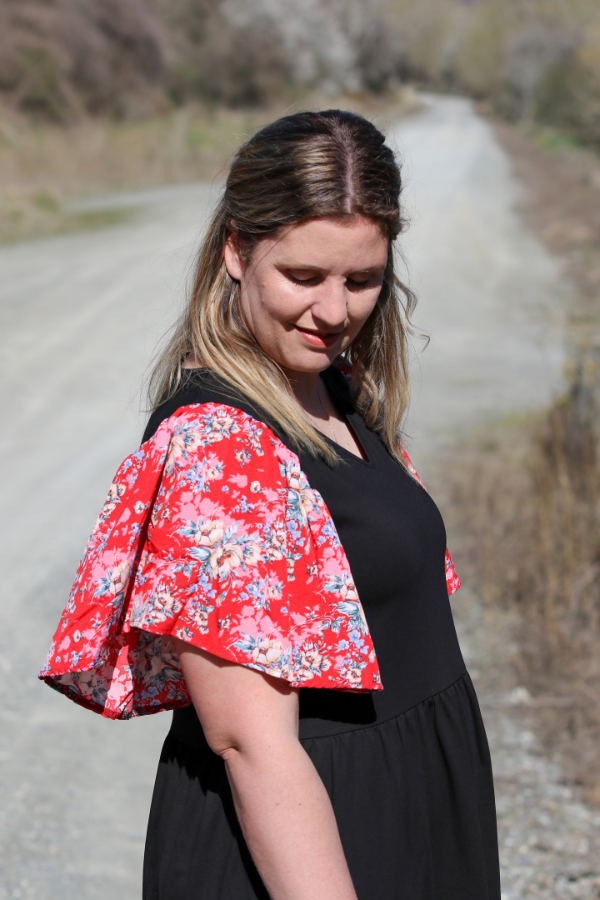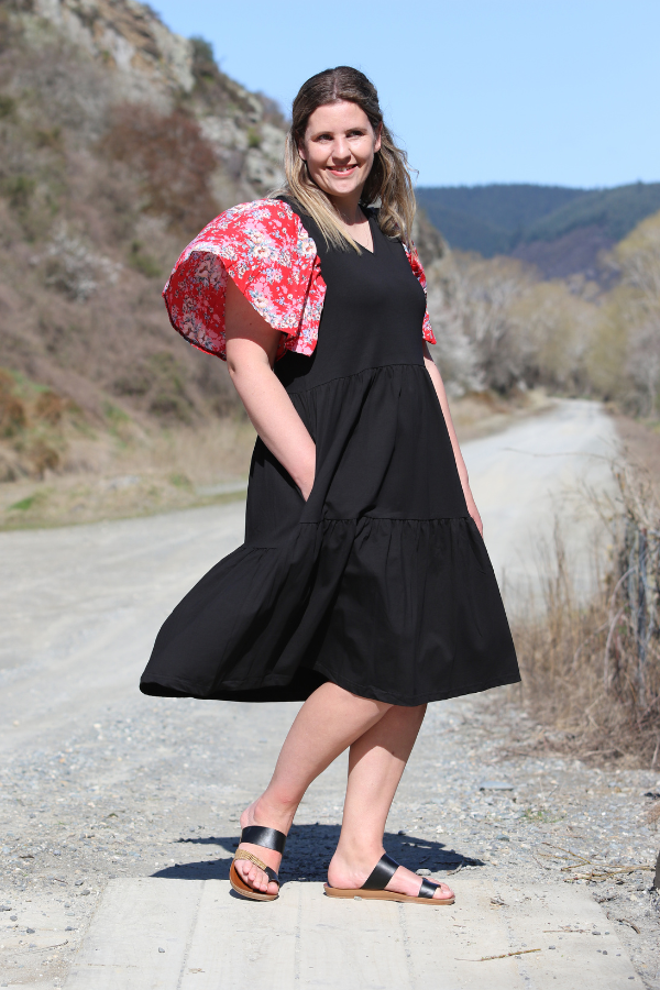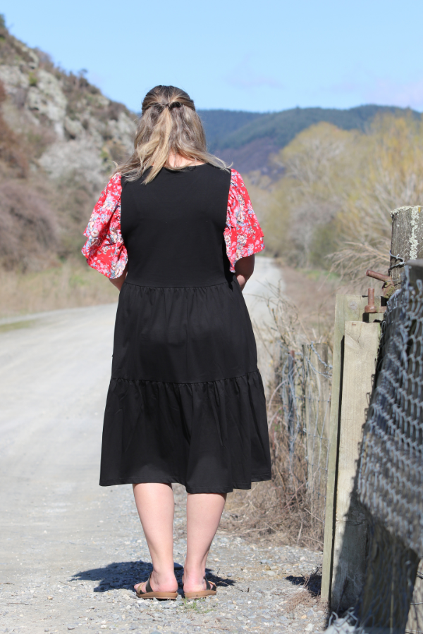 The Bella Dress by Emily Rose Designs is a lovely Black dress with a two tire ruffle dress. The Bella Dress is made from a thicker black cotton spandex , that is offset by Red floral chiffon sleeves . The Bella dress has a v neck and pockets.