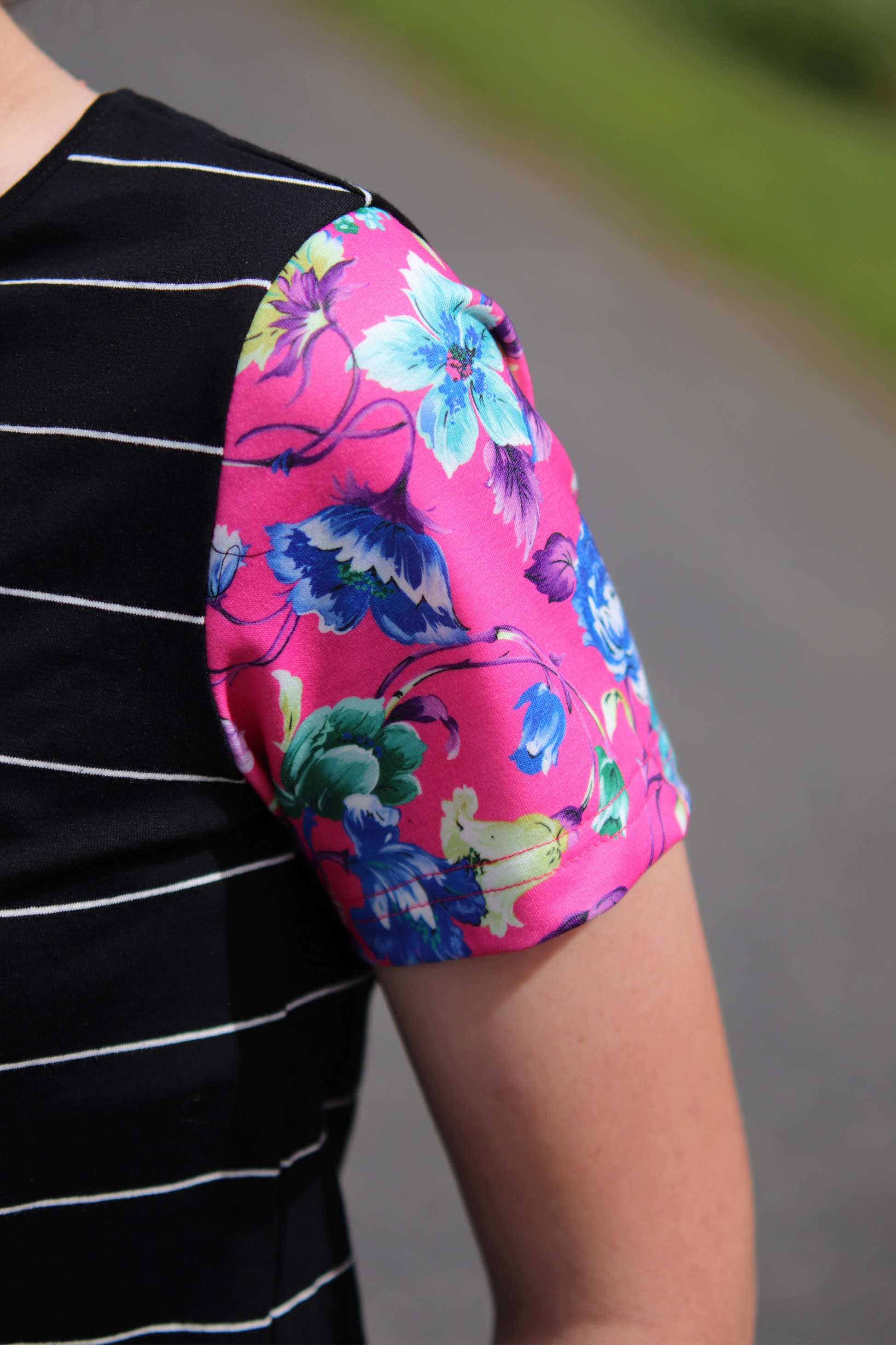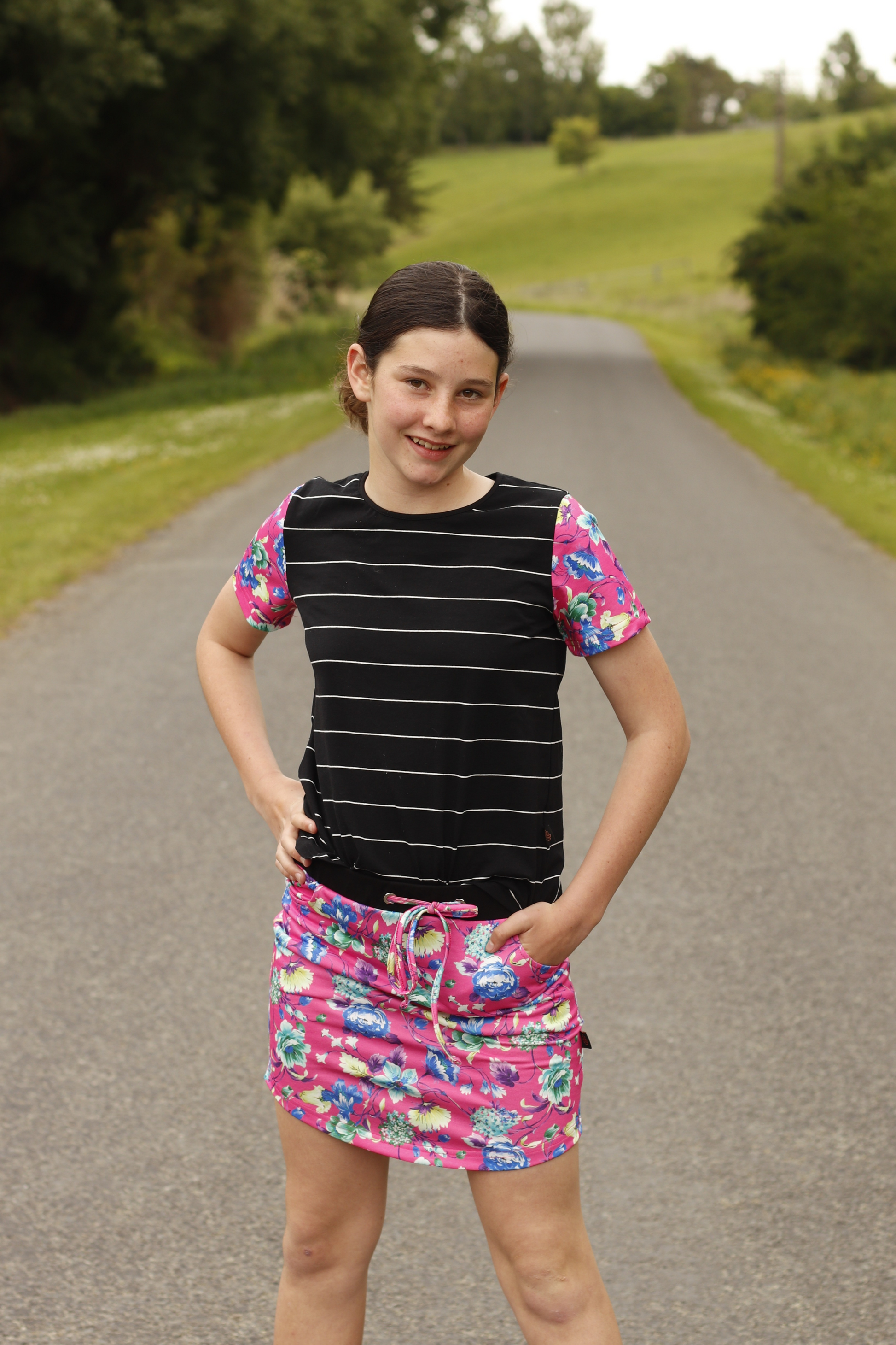What's not to Love about a stunning vibrant skirt with a elastic waistband and pockets of course ! This skirt is off set by our Black stripe Tee with pink floral Sleeves .