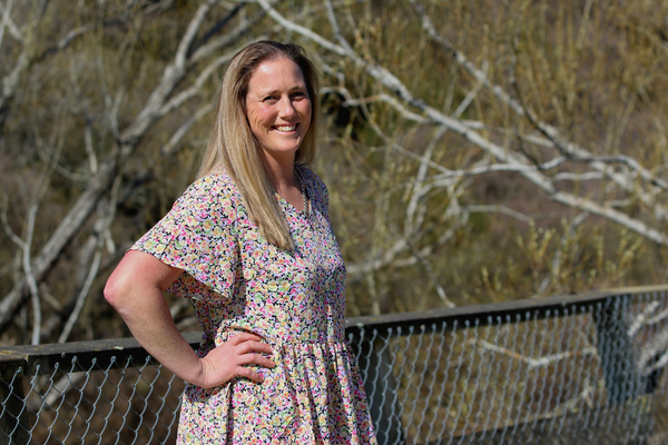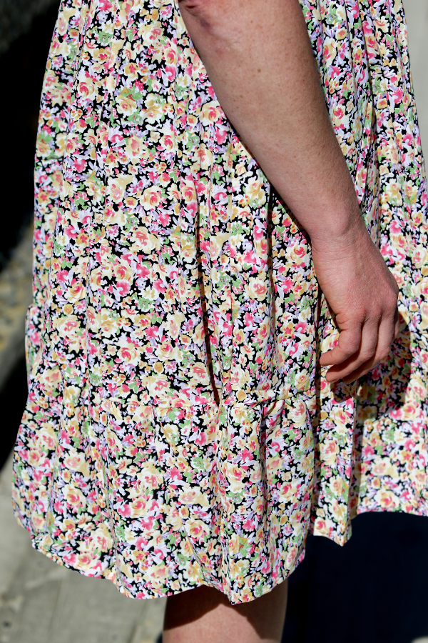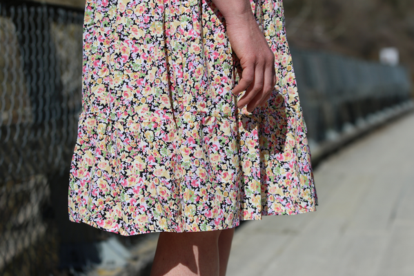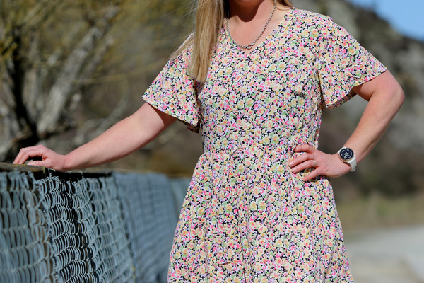 The Stacey Dress in blush from Emily Rose Designs is a comfortable, semi-fitted dress with a simple three layer look with a bottom frill . The Stacey Dress has a beautiful vibrant floral print with a yellow background.